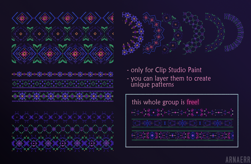 I realized that I would need to use the patterns I created for Paravastora (my original setting) quite often, so I decided to make some layered pattern brushes :) 3 brushes from this set are available for free on my Patreon. For Clip Studio Paint only.