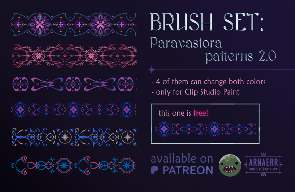 I made some more Clip Studio Paint pattern brushes for my original universe Paravastora! One of these brushes is available for free on my Patreon page.